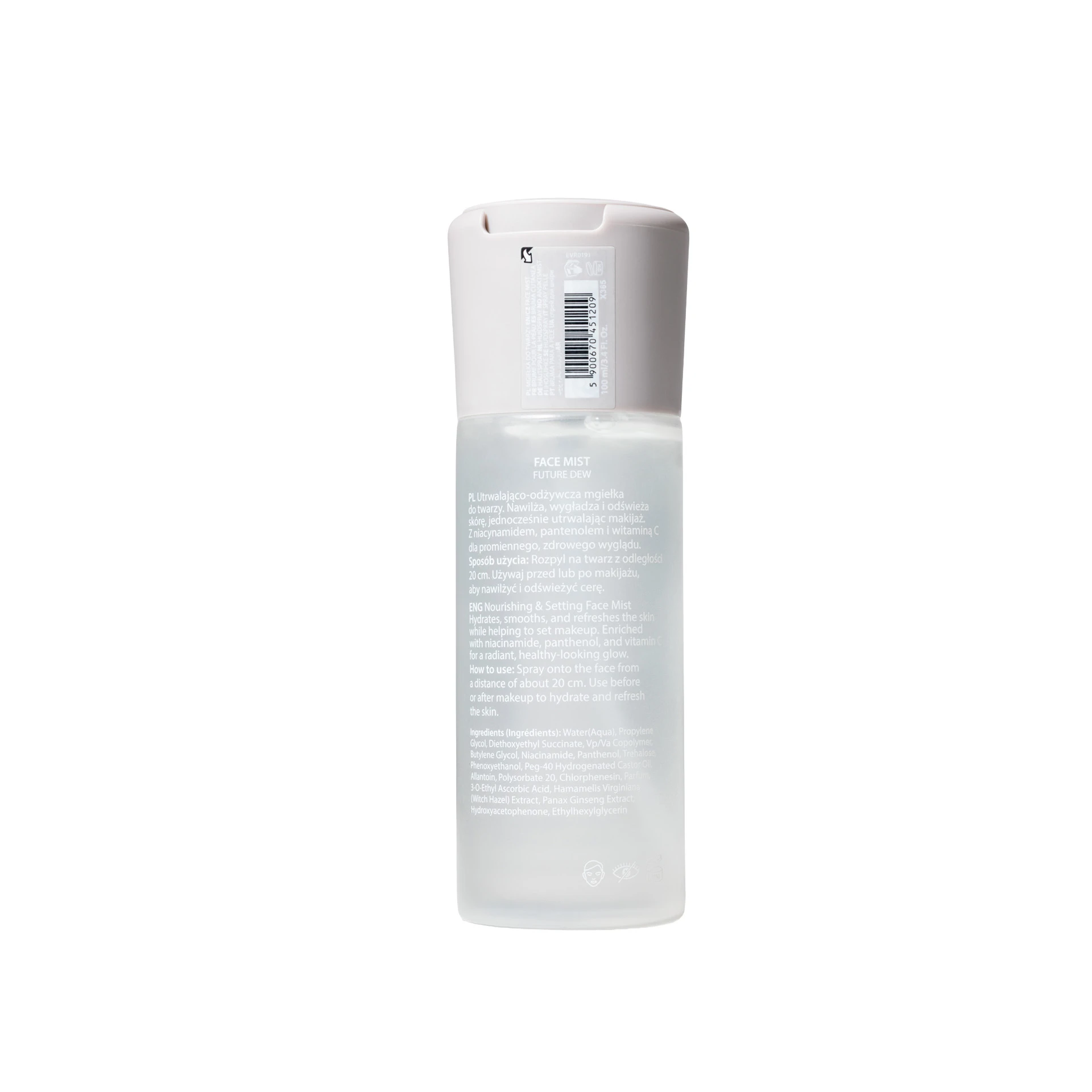 Odkryj natychmiastowy sposób na promienną i nawilżoną cerę. Future Dew to lekka, wielozadaniowa mgiełka do twarzy, która przywraca skórze komfort i nadaje jej pożądany efekt „wet skin”. Dzięki ultradelikatnej formule, produkt otula twarz odświeżającą chmurką. Nie narusza makijażu, nie pozostawia tłustej warstwy. Ściąga pudrowość, dzięki czemu makijaż wygląda świeżo i naturalnie, a dodatkowo, lepiej się utrzymuje.